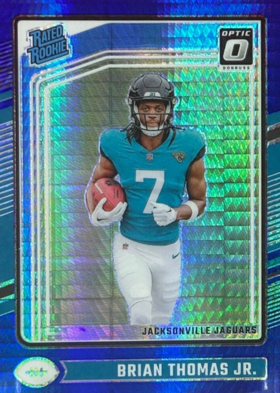 The Brian Thomas Jr. 2024 Optic #214 Blue Hyper Rookie card in Raw condition has moved up $0.62 (+30.7%) in the last 30 days and was last sold for $2.62 .