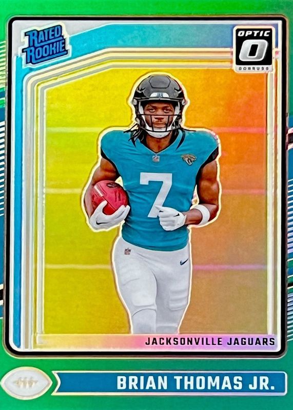 The Brian Thomas Jr. 2024 Optic #214 Green /5 Rookie card in Raw condition has not changed in price in the last 30 days and was last sold for $350.00 .