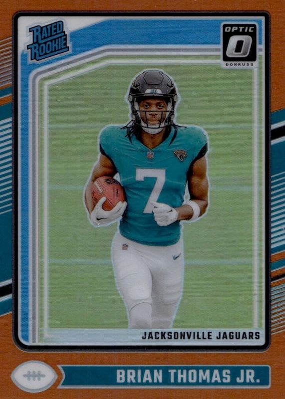 The Brian Thomas Jr. 2024 Optic #214 Orange /249 Rookie card in Raw condition has not changed in price in the last 30 days and was last sold for $14.50 .