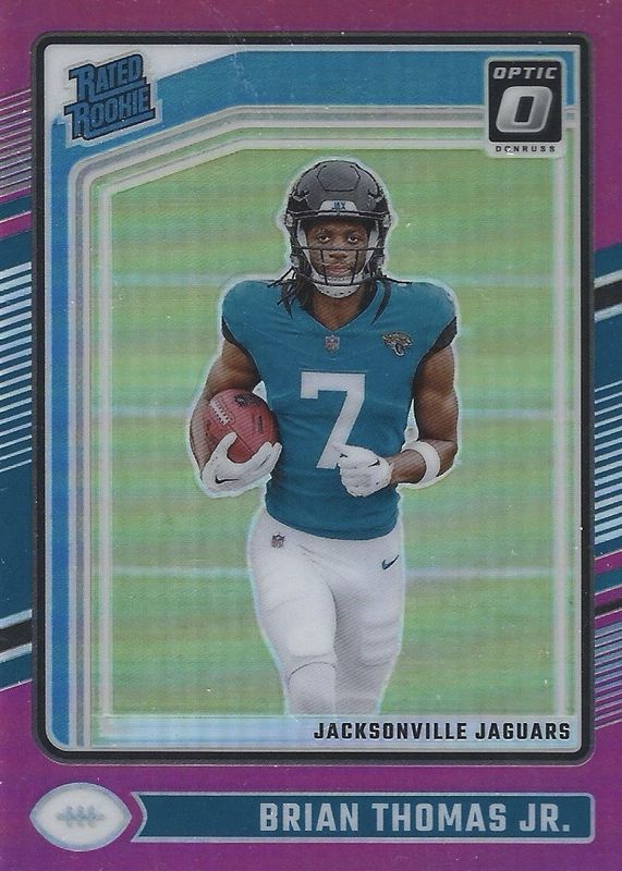 The Brian Thomas Jr. 2024 Optic #214 Pink Rookie card in Raw condition has moved down -$0.71 (-32.0%) in the last 30 days and was last sold for $1.51 .