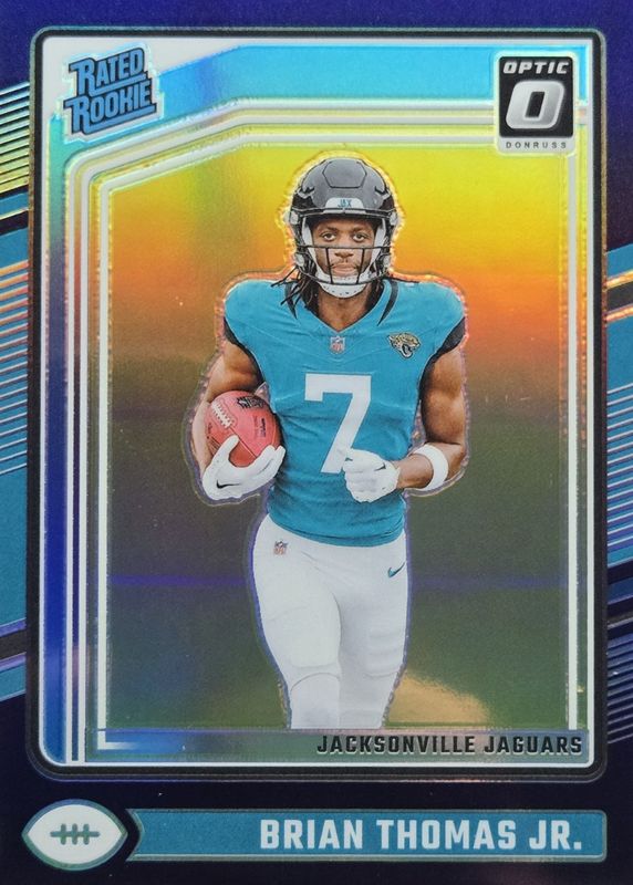 The Brian Thomas Jr. 2024 Optic #214 Purple /60 Rookie card in Raw condition has not changed in price in the last 30 days and was last sold for $22.50 .