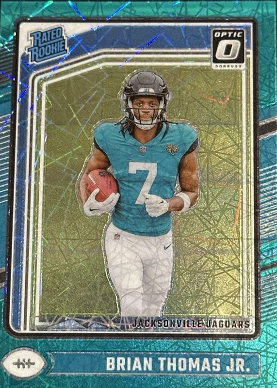 The Brian Thomas Jr. 2024 Optic #214 Teal Velocity Rookie card in Raw condition has moved up $3.54 (+30.9%) in the last 30 days and was last sold for $14.99 .