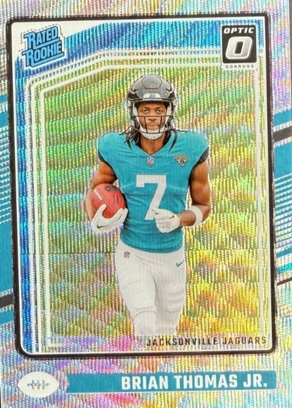 The Brian Thomas Jr. 2024 Optic #214 Wave /300 Rookie card in Raw condition has not changed in price in the last 30 days and was last sold for $15.00 .