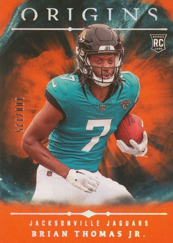 The Brian Thomas Jr. 2024 Origins #119 Orange /125 Rookie card in Raw condition has not changed in price in the last 30 days and was last sold for $1.50 .