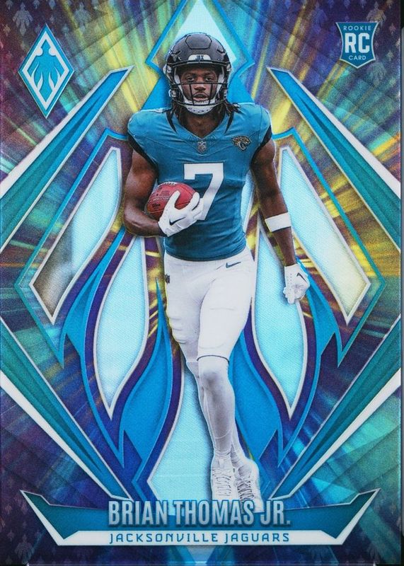 The Brian Thomas Jr. 2024 Phoenix #164 ColorBurst /10 Rookie card in Raw condition has not changed in price in the last 30 days and was last sold for $58.00 .