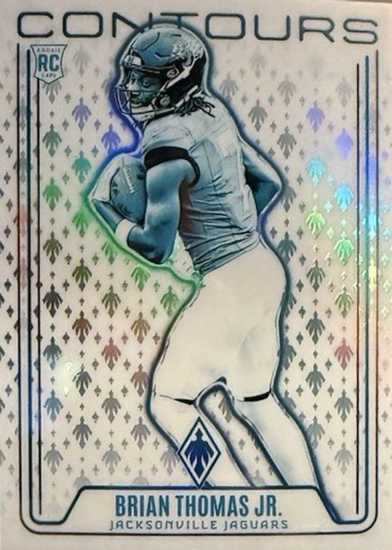 The Brian Thomas Jr. 2024 Phoenix #CON-BTJ Contours - Teal /40 Rookie card in Raw condition has not changed in price in the last 30 days and was last sold for $31.00 .
