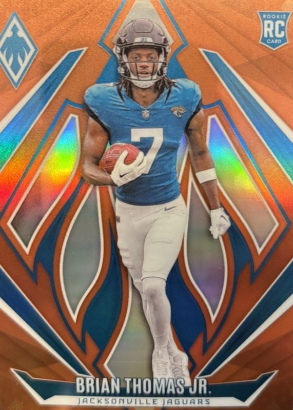 The Brian Thomas Jr. 2024 Phoenix #164 Orange Rookie card in Raw condition has moved down -$3.50 (-58.3%) in the last 30 days and was last sold for $2.50 .