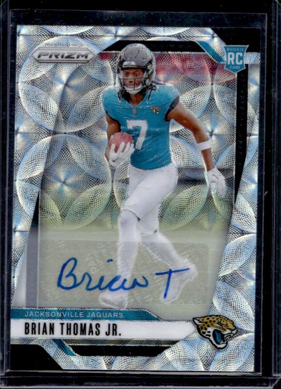 The Brian Thomas Jr. 2024 Prizm #314 Base Autographs - Choice /100 Rookie card is 1 of 146 Brian Thomas Jr.'s card variations in the 2024 Prizm set being tracked by Sports Card Investor, including Base, Choice Blue Yellow Green, Choice Silver, Disco, and Green.
