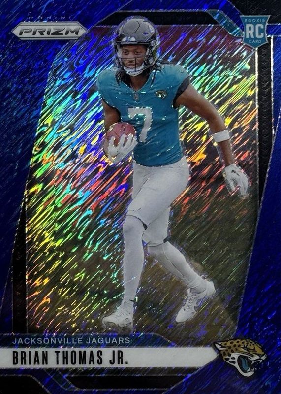 The Brian Thomas Jr. 2024 Prizm #314 Blue Shimmer /25 Rookie card in Raw condition has not changed in price in the last 30 days and was last sold for $265.00 .