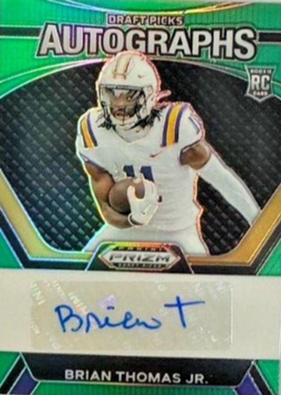 The Brian Thomas Jr. 2024 Prizm Draft Picks #DPA-BTJ Draft Picks Autographs - Green Rookie card in Raw condition has not changed in price in the last 30 days and was last sold for $24.95 .