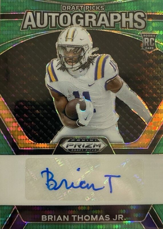The Brian Thomas Jr. 2024 Prizm Draft Picks #DPA-BTJ Draft Picks Autographs - Green Pulsar (/25) Rookie card in Raw condition has not changed in price in the last 30 days and was last sold for $51.00 .