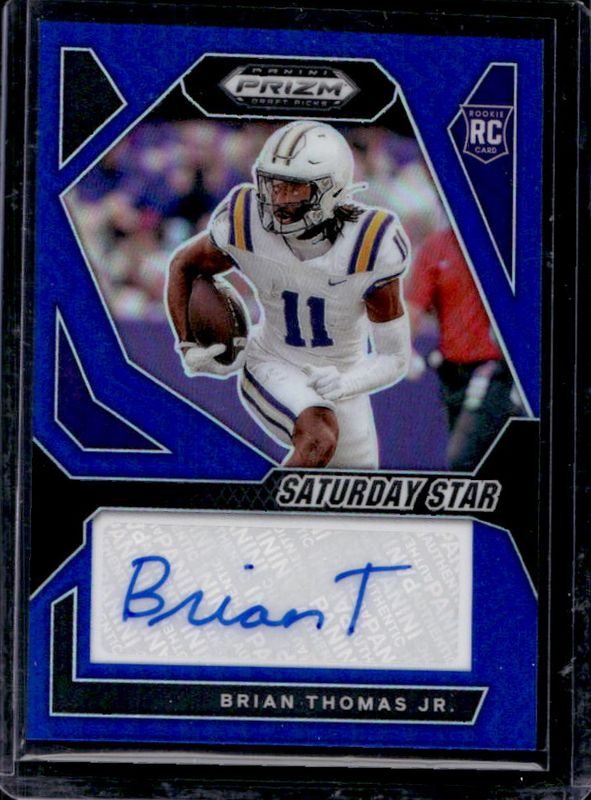 The Brian Thomas Jr. 2024 Prizm Draft Picks #SSS-BTJ Saturday Star Signatures - Blue /149 Rookie card is 1 of 148 Brian Thomas Jr.'s card variations in the 2024 Prizm Draft Picks set being tracked by Sports Card Investor, including Base, Green, Purple Wave, Red Ice, and Ruby Wave.