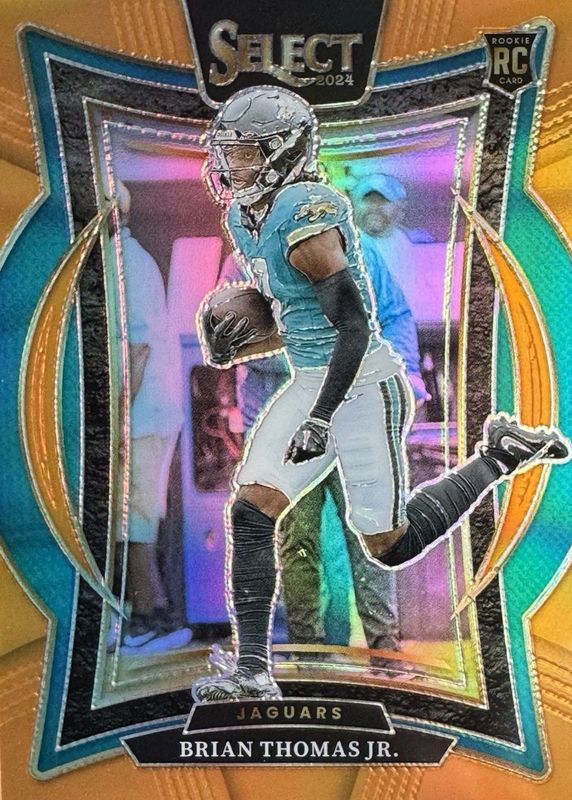 The Brian Thomas Jr. 2024 Select #91 Concourse Orange /49 Rookie card in Raw condition has moved up $1.50 (+66.7%) in the last 30 days and was last sold for $3.75 .