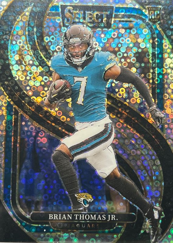 The Brian Thomas Jr. 2024 Select #143 Premier Level Disco Rookie card in Raw condition has not changed in price in the last 30 days and was last sold for $6.00 .
