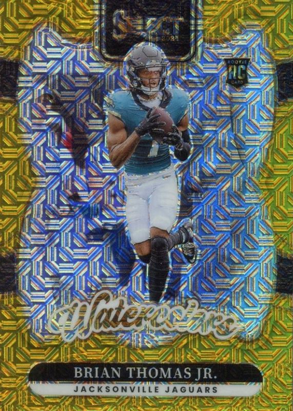 The Brian Thomas Jr. 2024 Select #19 Watercolors - Gold /10 Rookie card in Raw condition has not changed in price in the last 30 days and was last sold for $400.00 .