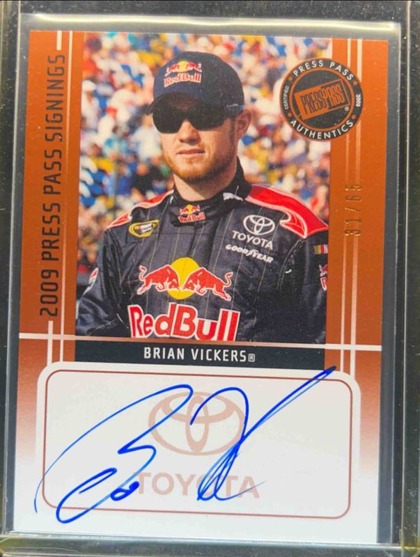 The Brian Vickers 2009 Press Pass Signings Bronze /65 card is 1 of 39 Brian Vickers' card variations in the 2009 Press Pass set being tracked by Sports Card Investor, including #185 Base, #154 Base, #15 Base, #185 Blue, and #15 Blue.