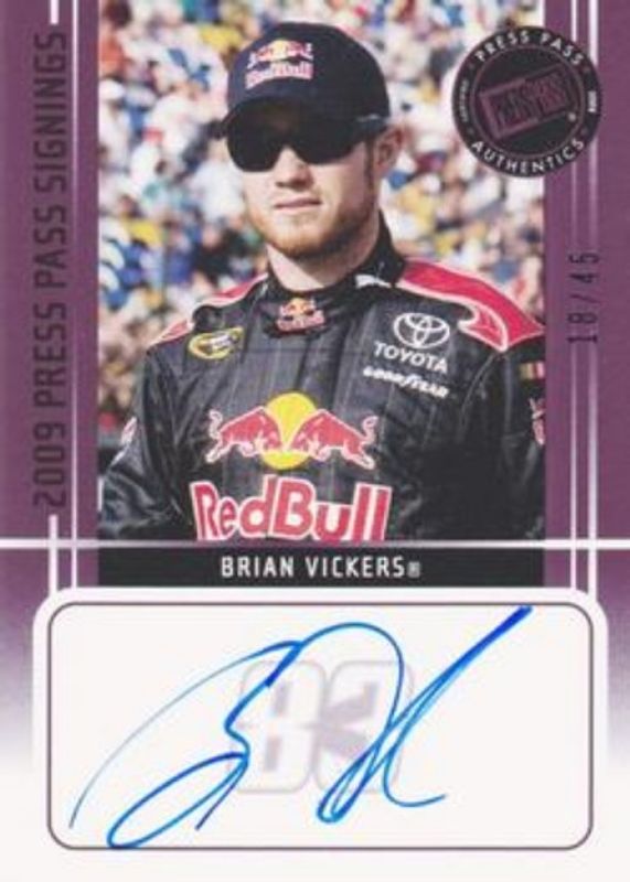 The Brian Vickers 2009 Press Pass Signings Purple /45 card is 1 of 39 Brian Vickers' card variations in the 2009 Press Pass set being tracked by Sports Card Investor, including #185 Base, #154 Base, #15 Base, #185 Blue, and #15 Blue.