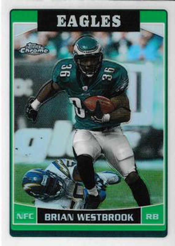 The Brian Westbrook 2006 Topps Chrome #77 Refractor card is 1 of 10 Brian Westbrook's card variations in the 2006 Topps Chrome set being tracked by Sports Card Investor, including Base, Printing Plates Black /1, Printing Plates Cyan /1, Printing Plates Magenta /1, and Printing Plates Yellow /1.