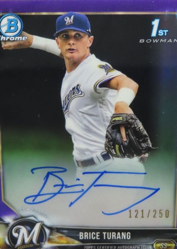 The Brice Turang 2018 Bowman Draft #CDA-BT Chrome DP Auto - Purple Refractor /250 (1st) card in Raw condition has not changed in price in the last 30 days and was last sold for $92.00 .