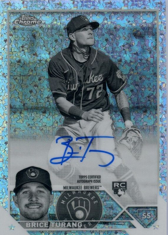 This card is 1 of 17 Brice Turang's card variations in the 2023 Topps Chrome set being tracked by Sports Card Investor, including Rookie Autographs, Rookie Autographs - Refractor /499, Rookie Autographs - Purple Speckle Refractor /299, Rookie Autographs - Purple Refractor /250, and Rookie Autographs - Aqua Wave Refractor /199.