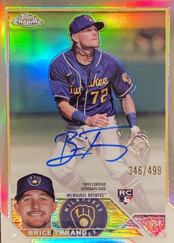 The Brice Turang 2023 Topps Chrome #RA-BT Rookie Autographs - Refractor /499 card in Raw condition has moved down -$19.65 (-30.4%) in the last 30 days and was last sold for $45.00 .