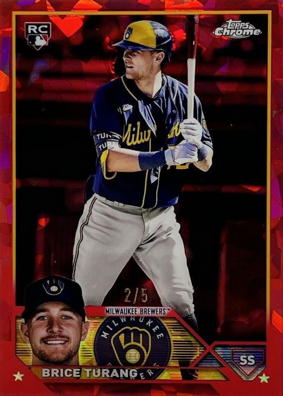 The Brice Turang 2023 Topps Chrome Sapphire Edition #530 Red /5 Rookie card in Raw condition has not changed in price in the last 30 days and was last sold for $158.05 .