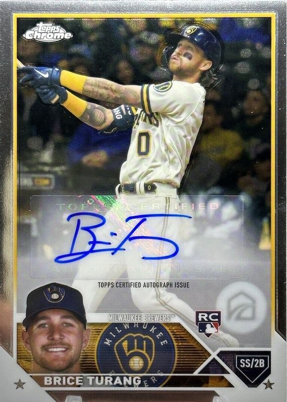 The Brice Turang 2023 Topps Chrome Update #AC-BTU Autographs Rookie card in Raw condition has moved down -$4.65 (-19.4%) in the last 30 days and was last sold for $19.35 .