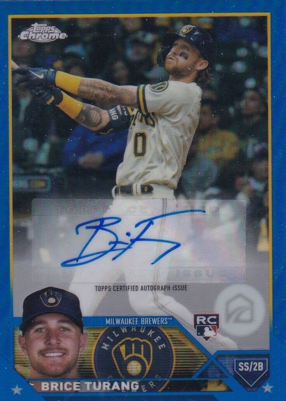 The Brice Turang 2023 Topps Chrome Update #AC-BTU Autographs - Blue Refractor /150 Rookie card in Raw condition has not changed in price in the last 30 days and was last sold for $31.00 .