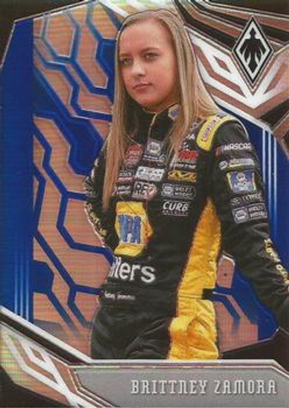 The Brittney Zamora 2020 Chronicles NASCAR #11 Phoenix Blue /199 Rookie card is 1 of 46 Brittney Zamora's card variations in the 2020 Chronicles NASCAR set being tracked by Sports Card Investor, including Ascension, Crusade, Crusade Holo, Phoenix, and Phoenix Holo.