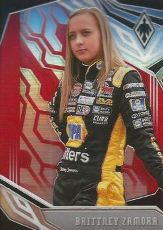 The Brittney Zamora 2020 Chronicles NASCAR #11 Phoenix Red /99 Rookie card is 1 of 46 Brittney Zamora's card variations in the 2020 Chronicles NASCAR set being tracked by Sports Card Investor, including Ascension, Crusade, Crusade Holo, Phoenix, and Phoenix Holo.