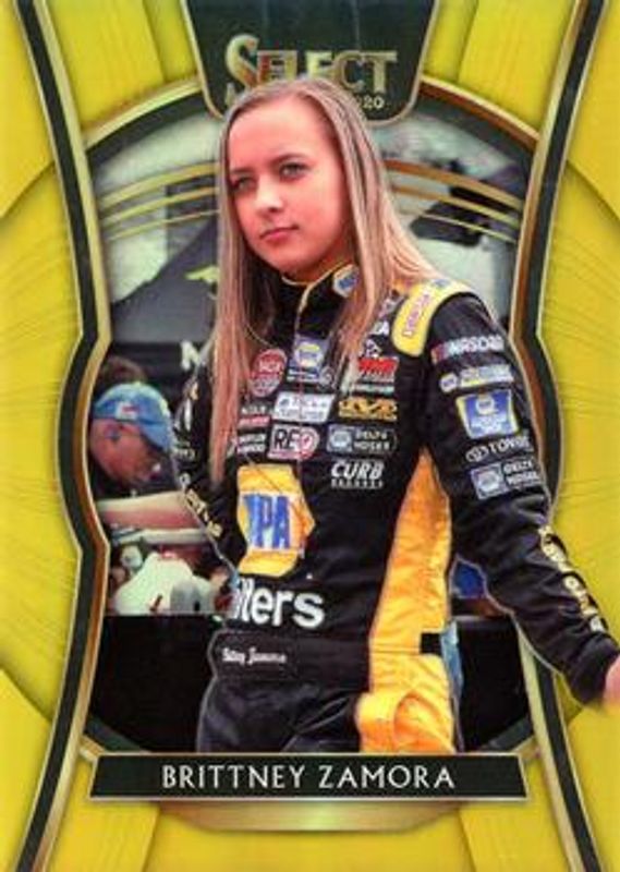 The Brittney Zamora 2020 Chronicles NASCAR #11 Select Gold /10 Rookie card is 1 of 46 Brittney Zamora's card variations in the 2020 Chronicles NASCAR set being tracked by Sports Card Investor, including Ascension, Crusade, Crusade Holo, Phoenix, and Phoenix Holo.