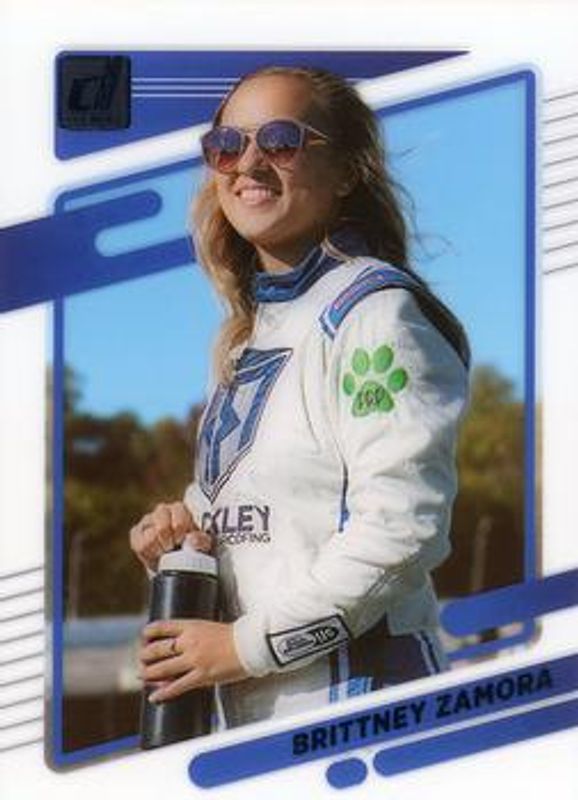 The Brittney Zamora 2022 Chronicles NASCAR #5 Clearly Donruss card is 1 of 87 Brittney Zamora's card variations in the 2022 Chronicles NASCAR set being tracked by Sports Card Investor, including Black, Black Autographs, Black Green, Clear Vision, and Contenders Optic.