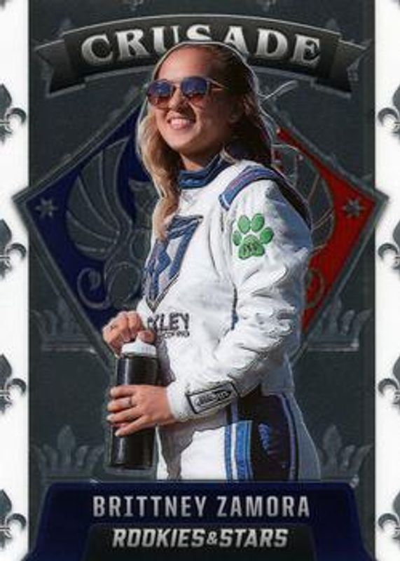 The Brittney Zamora 2022 Chronicles NASCAR #1 Crusade card is 1 of 87 Brittney Zamora's card variations in the 2022 Chronicles NASCAR set being tracked by Sports Card Investor, including Black, Black Autographs, Black Green, Clearly Donruss, and Clear Vision.