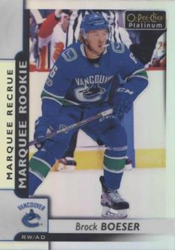 The Brock Boeser 2017 O-Pee-Chee Platinum #165 Rainbow Rookie card is 1 of 33 Brock Boeser's card variations in the 2017 O-Pee-Chee Platinum set being tracked by Sports Card Investor, including Base, Violet Pixels, Red Prism /199, Royal Blue Cubes /99, and Seismic Gold /50.
