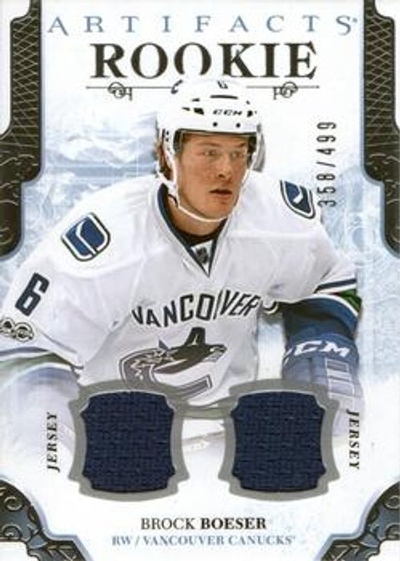 The Brock Boeser 2017 Upper Deck Artifacts #171 Materials Silver /125 Rookie card is 1 of 16 Brock Boeser's card variations in the 2017 Upper Deck Artifacts set being tracked by Sports Card Investor, including Base /799, Ruby /299, Auto Material Silver /99, Emerald /99, and Orange /55.