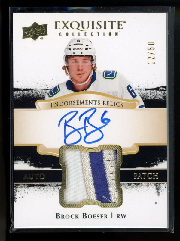 The Brock Boeser 2017 Upper Deck The Cup #ER-BB Exquisite Collection Endorsements Autographs - Relics /50 Rookie card is 1 of 166 Brock Boeser's card variations in the 2017 Upper Deck The Cup set being tracked by Sports Card Investor, including Base /249, Gold Spectrum Foil /36, Gold Foil Patch /24, Red Foil Tag /8, and Rookies Gold Spectrum /4.