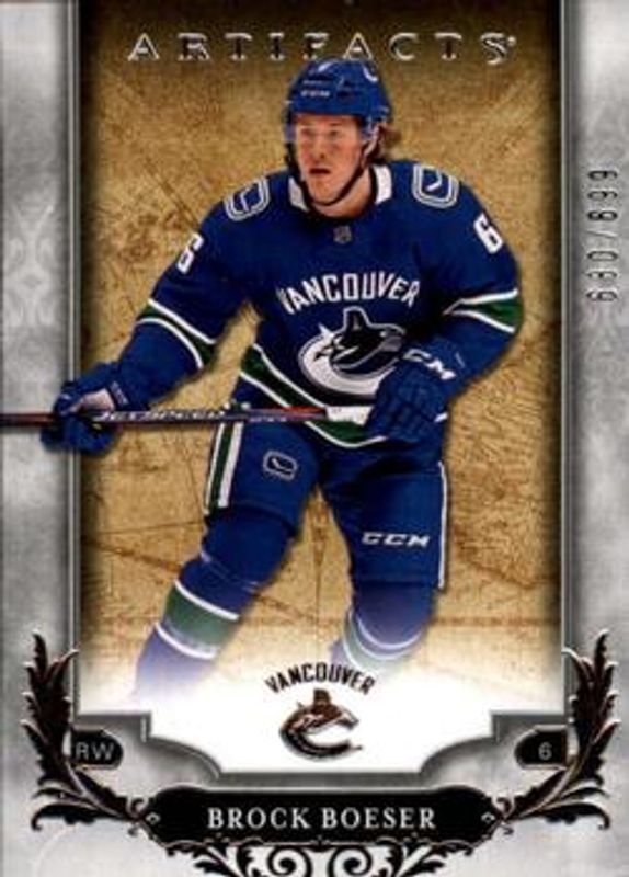 The Brock Boeser 2018 Upper Deck Artifacts #110 Base /799 card is 1 of 19 Brock Boeser's card variations in the 2018 Upper Deck Artifacts set being tracked by Sports Card Investor, including Ruby /349, Emerald /99, Aqua /45, Purple /20, and Black /5.