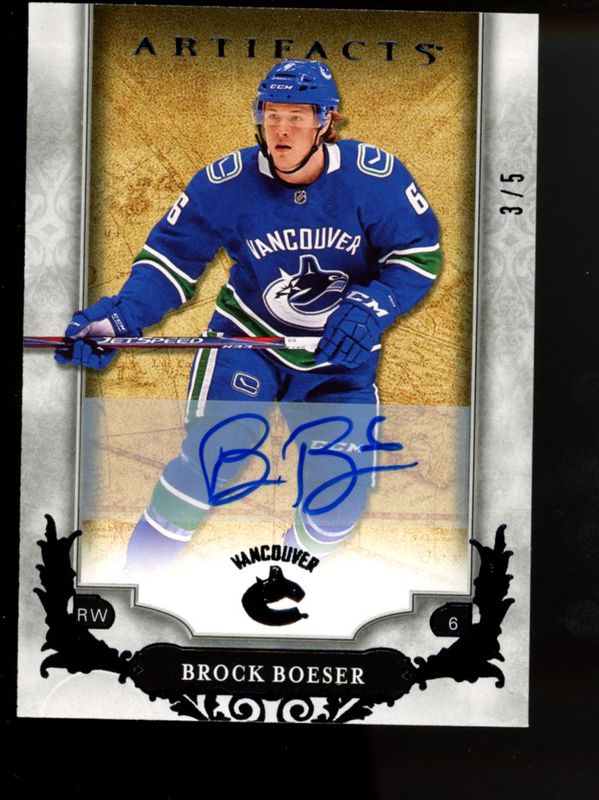 The Brock Boeser 2018 Upper Deck Artifacts #110 Black /5 card is 1 of 19 Brock Boeser's card variations in the 2018 Upper Deck Artifacts set being tracked by Sports Card Investor, including Base /799, Ruby /349, Emerald /99, Aqua /45, and Purple /20.