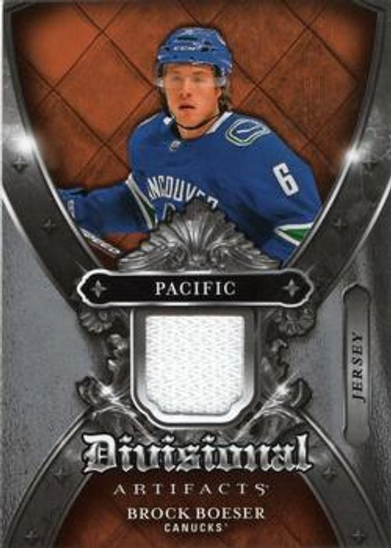The Brock Boeser 2018 Upper Deck Artifacts #DA-BO Divisional Artifacts card is 1 of 19 Brock Boeser's card variations in the 2018 Upper Deck Artifacts set being tracked by Sports Card Investor, including Base /799, Ruby /349, Emerald /99, Aqua /45, and Purple /20.