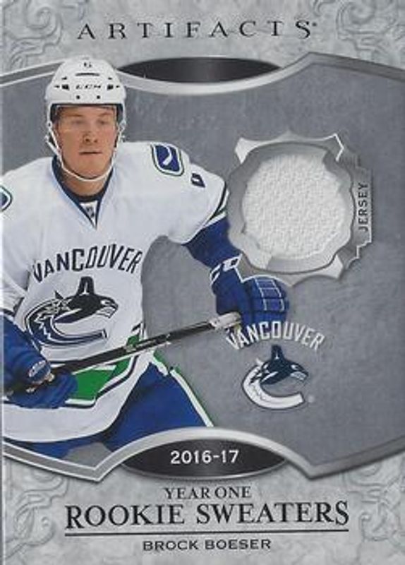 The Brock Boeser 2018 Upper Deck Artifacts #RS-BB Year One Rookie Sweaters card is 1 of 19 Brock Boeser's card variations in the 2018 Upper Deck Artifacts set being tracked by Sports Card Investor, including Base /799, Ruby /349, Emerald /99, Aqua /45, and Purple /20.