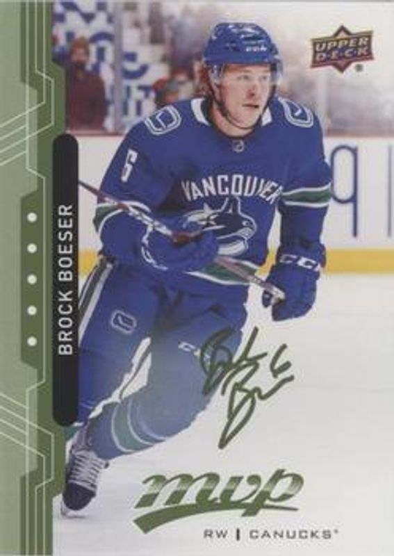 The Brock Boeser 2018 Upper Deck MVP #211 Green Script card is 1 of 21 Brock Boeser's card variations in the 2018 Upper Deck MVP set being tracked by Sports Card Investor, including Base, Factory Set Blue, Silver Script, Gold Script /150, and Super Script /25.