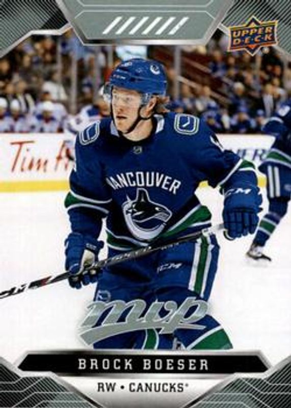 The Brock Boeser 2019 Upper Deck MVP #65 Base card is 1 of 17 Brock Boeser's card variations in the 2019 Upper Deck MVP set being tracked by Sports Card Investor, including Blue, Gold Script, Puzzle Backs, Silver Script, and Super Script /25.