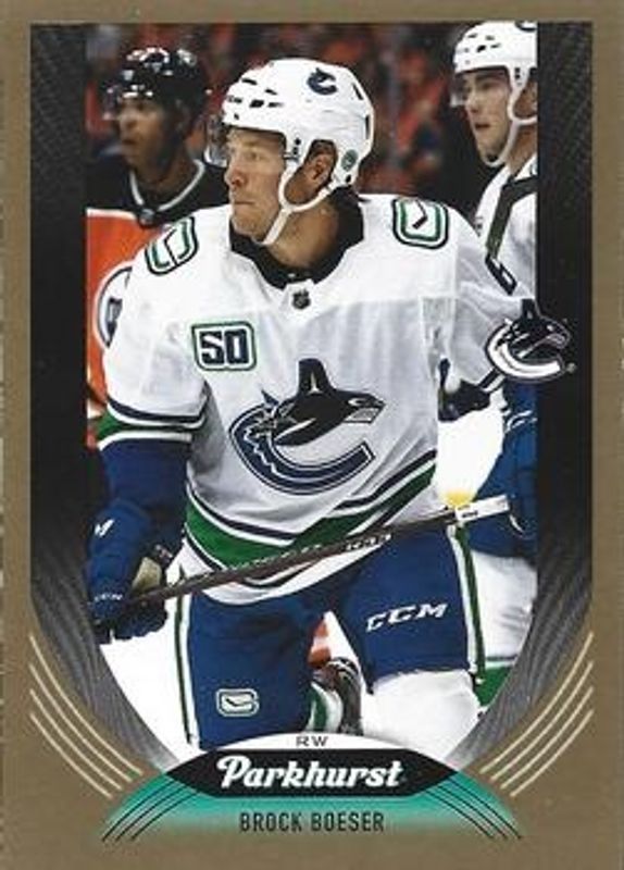 The Brock Boeser 2020 Upper Deck Parkhurst #255 Gold card is 1 of 6 Brock Boeser's card variations in the 2020 Upper Deck Parkhurst set being tracked by Sports Card Investor, including Base, Silver, Bronze, Gold Foil, and Emerald Ice Achievements /5.