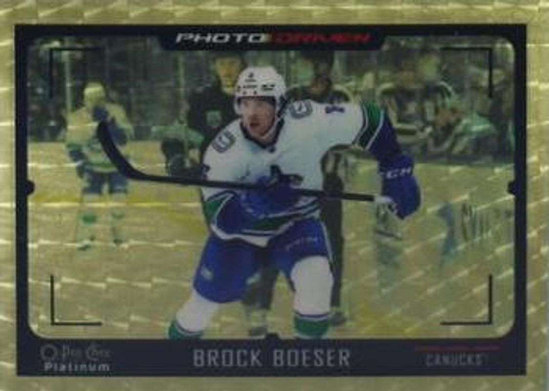 The Brock Boeser 2021 O-Pee-Chee Platinum #PD-8 Photo Driven Golden Treasures /1 card is 1 of 28 Brock Boeser's card variations in the 2021 O-Pee-Chee Platinum set being tracked by Sports Card Investor, including Base, Blue Surge, Matte Pink, Neon Yellow Surge, and Rainbow.
