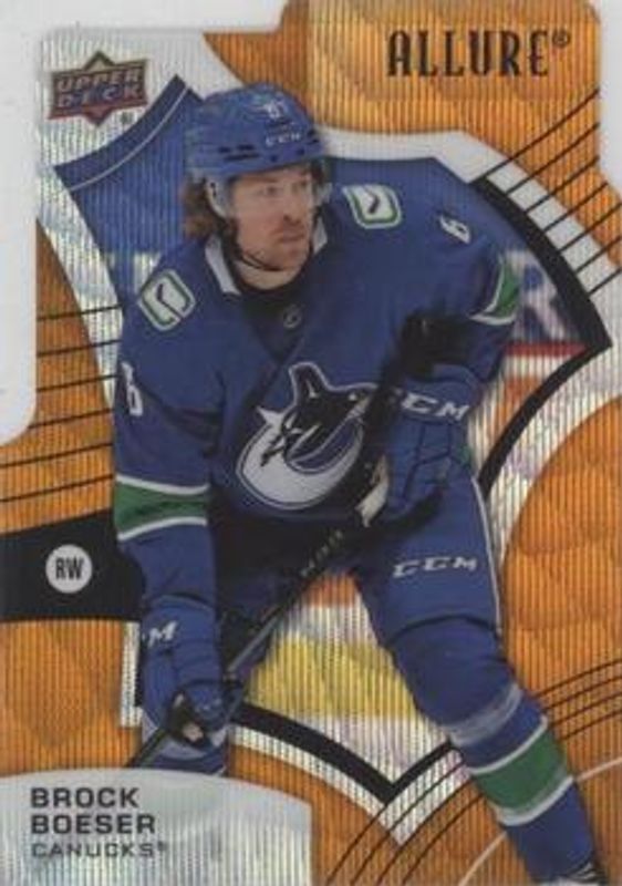 The Brock Boeser 2021 Upper Deck Allure #68 Orange Slice die-cut card is 1 of 33 Brock Boeser's card variations in the 2021 Upper Deck Allure set being tracked by Sports Card Investor, including Base, Black Rainbow, Blue China, Pink Blue Leopard, and Red Rainbow.