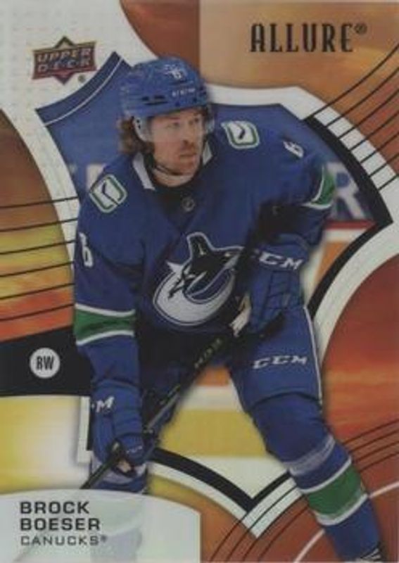 The Brock Boeser 2021 Upper Deck Allure #68 Sunrise card is 1 of 33 Brock Boeser's card variations in the 2021 Upper Deck Allure set being tracked by Sports Card Investor, including Base, Black Rainbow, Blue China, Orange Slice die-cut, and Pink Blue Leopard.