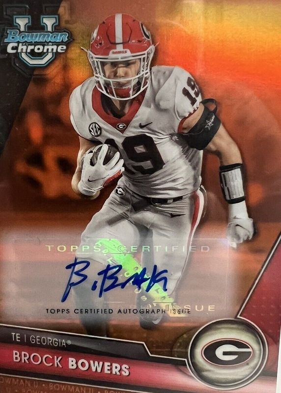 This card is 1 of 25 Brock Bowers' card variations in the 2023 Bowman Chrome University set being tracked by Sports Card Investor, including Prospect Auto, Prospect Auto - Refractor /499, Prospect Auto - Fuchsia Mini-Diamond Refractor /150, The Big Kahuna Autographs /150, and 1955 Bowman Football Autographs /99.