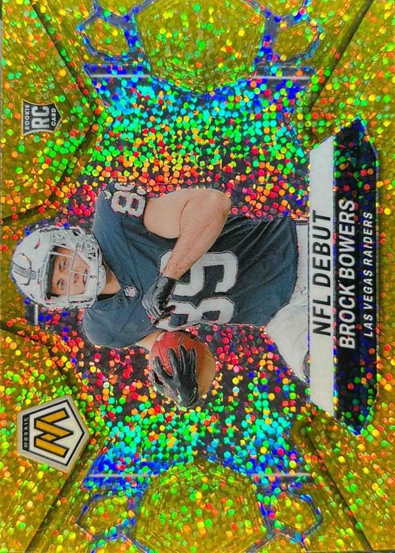 The Brock Bowers 2024 Mosaic #286 NFL Debut - Gold Sparkle /24 Rookie card in Raw condition has not changed in price in the last 30 days and was last sold for $152.50 .