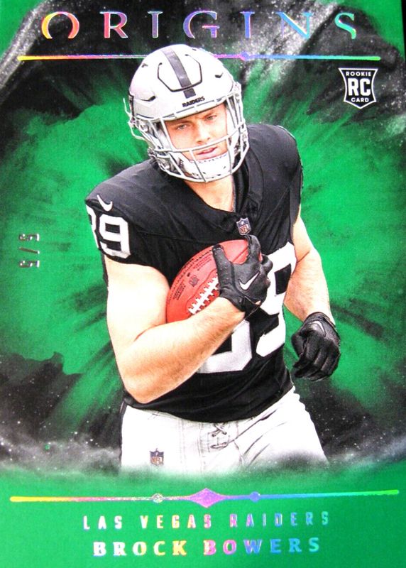 The Brock Bowers 2024 Origins #146 Green /5 Rookie card in Raw condition has not changed in price in the last 30 days and was last sold for $129.99 .