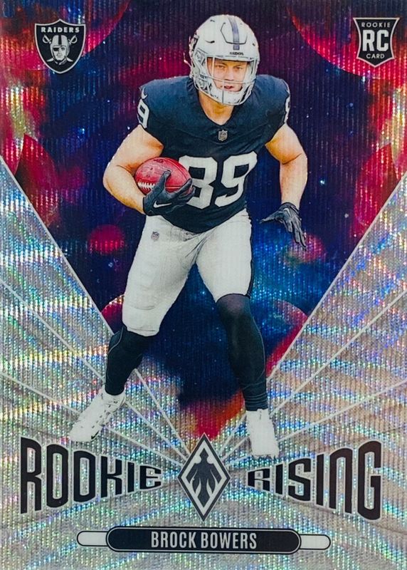 The Brock Bowers 2024 Phoenix #RR-BBS Rookie Rising - Wave card in Raw condition has moved up $3.24 (+247%) in the last 30 days and was last sold for $4.55 .